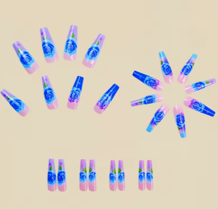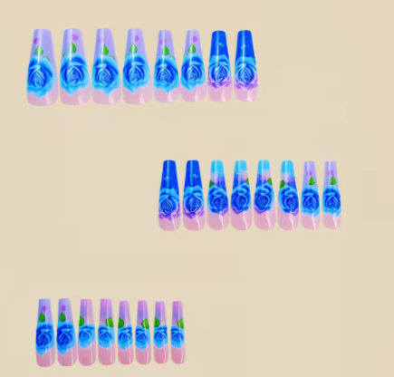 Colorful Gradient Flower Nail Stickers. This Set Includes 24 Removable Press-On Nail Tips in Beautiful Blue Shades.