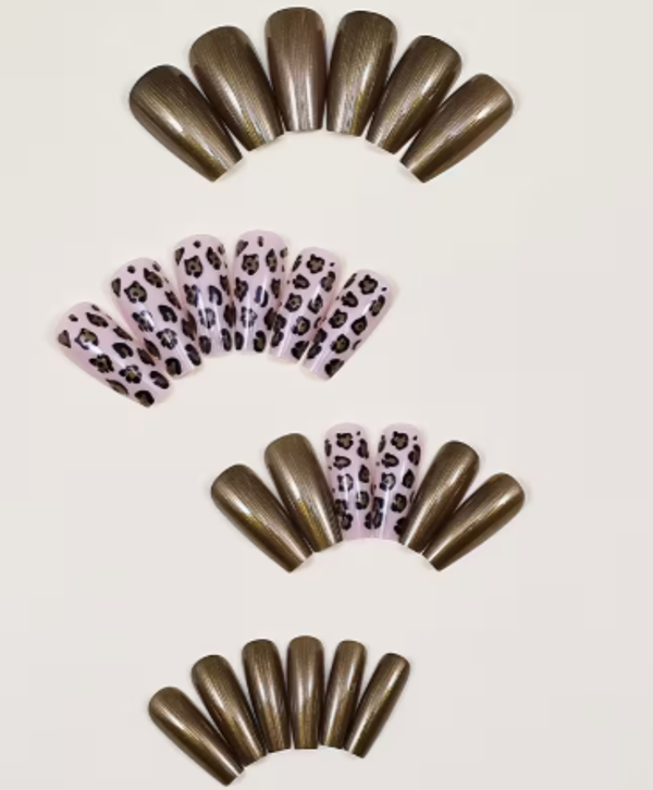 Leopard Print Press On Nails with Metallic Golden - Long Coffin/Shadow