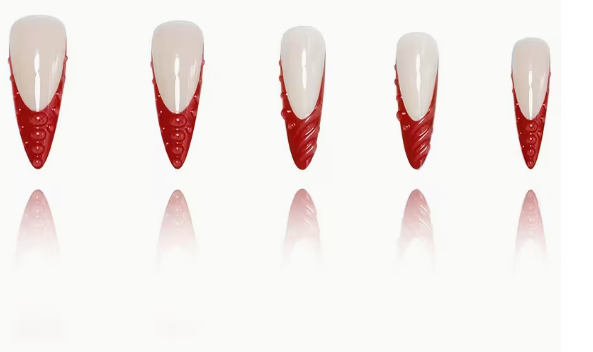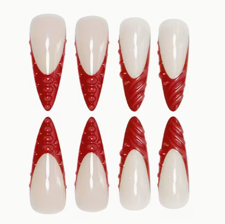 Almond-Shaped False Nails French Style Bright Fiery Red Glossy Shiny Fashionable Spiral Moist Round Beads