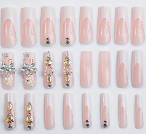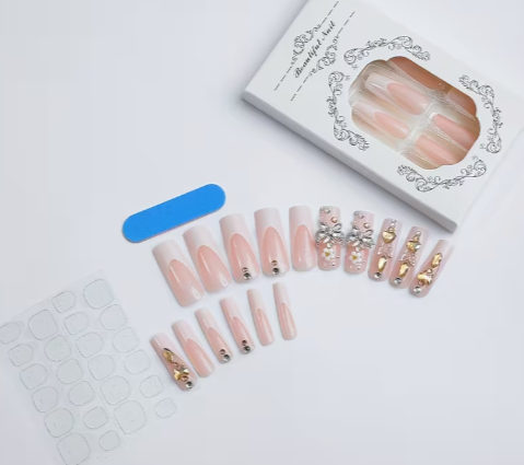 4pcs long square autumn and winter new daughter Butterfly fairy White French edge gorgeous ball party essential nail (Golden theme) with jelly glue 1pc and file strip 1pc