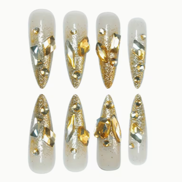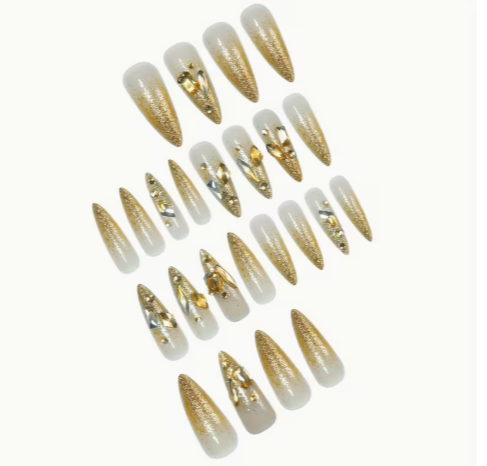 Almond-Shaped False Nails, Luxurious, Dazzling, Golden Glitter, Fashionable, Elegant,